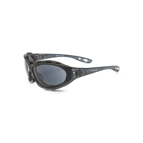 Descripción: Lentes de seguridad con montura resistente y lentes grises de policarbonato, con tratamiento antiempañante. Ofrecen protección UV y resistencia a impactos, ideales para uso en exteriores y condiciones de luz intensa.