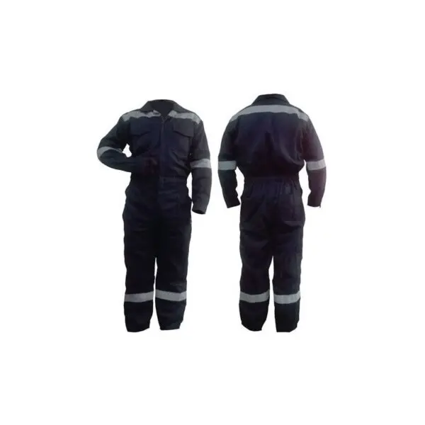 Mameluco de trabajo en tela drill (30 % algodón, 70 % poliéster) diseñado para protección y comodidad durante labores industriales. Dispone de seis bolsillos que facilitan el almacenamiento de herramientas, pretina posterior elástica para ajuste, puños con botones de seguridad y cinta reflectiva en piernas, brazos, espalda y pecho para mayor visibilidad.