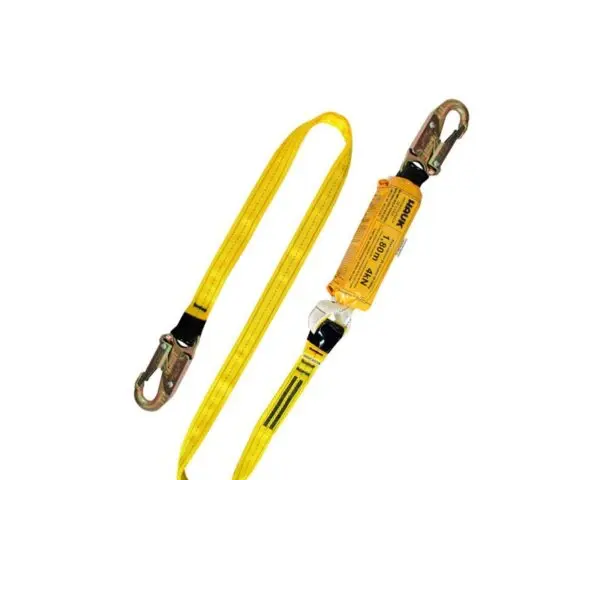 descripcion: Línea de conexión con amortiguador de caída equipada con un gancho chico y un gancho grande, diseñada para absorber la energía generada durante una caída y minimizar el impacto en el trabajador. Ofrece una conexión segura entre el arnés y el punto de anclaje.