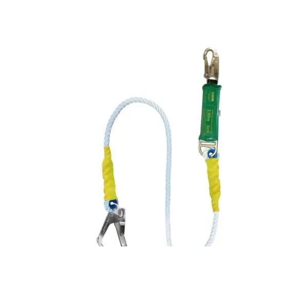 descripcion: Otra versión de la línea de conexión con amortiguador de caída, con un gancho chico y uno grande, diseñada para ofrecer versatilidad en puntos de anclaje manteniendo protección contra caídas.