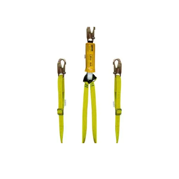 descripcion: Línea de conexión regulable doble con amortiguador de caída factor 1, equipada con tres ganchos de ¾″. Diseñada para garantizar conexión continua y absorción de impacto en trabajos en altura.