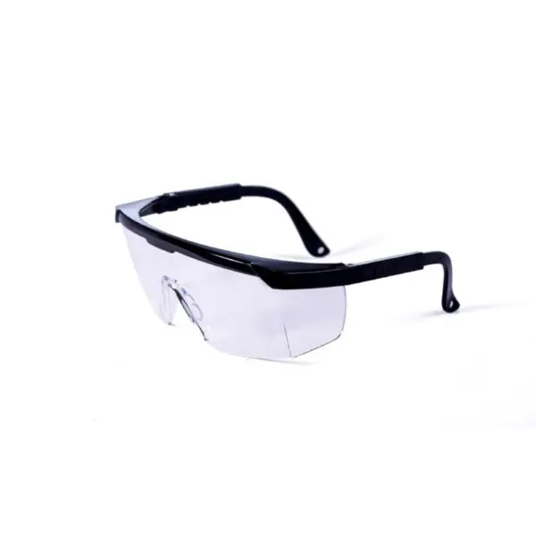 Descripción: Anteojos de seguridad con montura negra y lentes claros de policarbonato. Ofrecen protección UV y resistencia a impactos, ideales para uso en interiores y exteriores con luz normal.