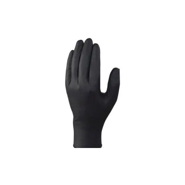 Guante de nitrilo sin polvo, color negro, que proporciona resistencia al agua y al polvo, buena elasticidad y sensibilidad al tacto. No contiene látex, reduciendo el riesgo de alergias, y es apto para contacto con alimentos.